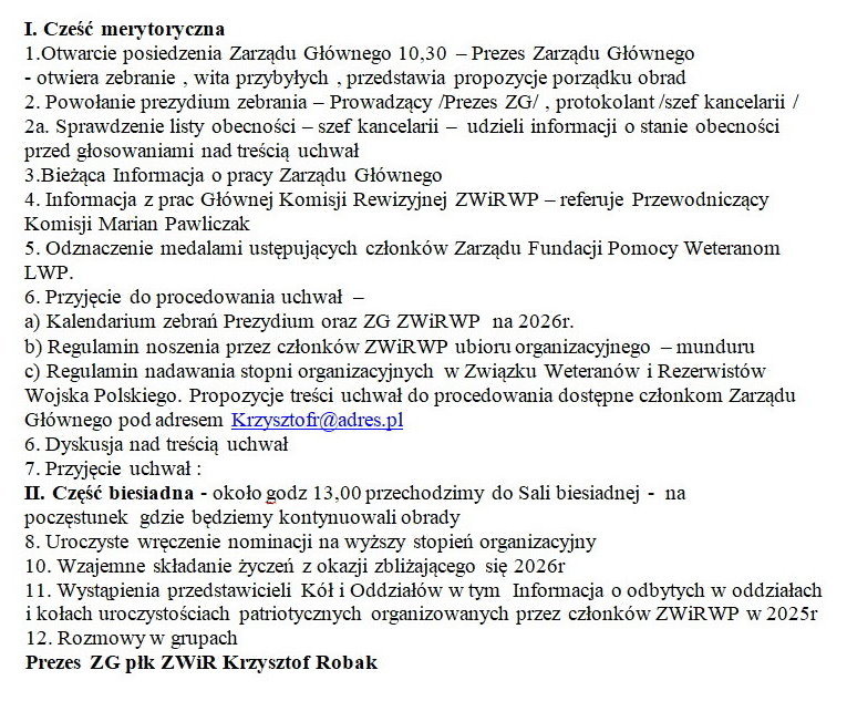 Zapraszamy na uroczyste zebranie biesiadne kończące pracę ZG w 2025r. Zebranie Zarządu Głównego Związku Weteranów i Rezerwistów Wojska Polskiego które odbędzie się w terminie 11 grudnia 2025r godz. 10:30, miejsce zebrania Warszawa Al. Ujazdowskie 6 A. Z uwagi na przewidywany poczęstunek w sali restauracji prosimy członków Zarządu Głównego o potwierdzenie pobytu oraz podanie ilości osób towarzyszących w terminie do 1 grudnia 2025r. godz. 18 na nr tel.601-372-509.